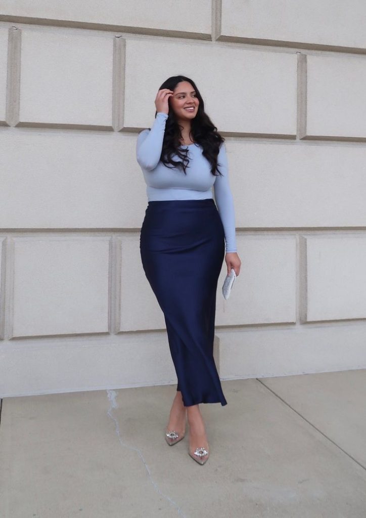 A long navy blue pencil skirt in sleek satin flows gracefully, paired with a soft gray long-sleeved top. The effortless drape adds a touch of formality, making it perfect for work or formal occasions. Diamond-studded heels complete the refined look.