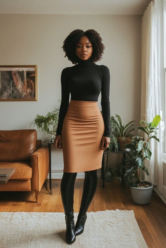 A classic brown pencil skirt paired with a black turtleneck creates an elegant yet effortless silhouette, perfect for work or business meetings. The addition of black leather boots and sleek tights ensures warmth, making this a go-to choice for winter dressing. The fitted top balances the structured skirt, enhancing the aesthetic of a well-curated outfit.