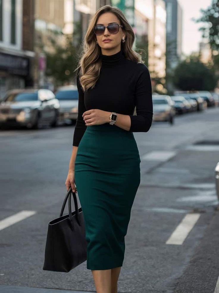 A structured green pencil skirt pairs flawlessly with a black turtleneck, creating a powerful yet minimalist for work look. The oversized black leather handbag and classic sunglasses complete the monochrome aesthetic.