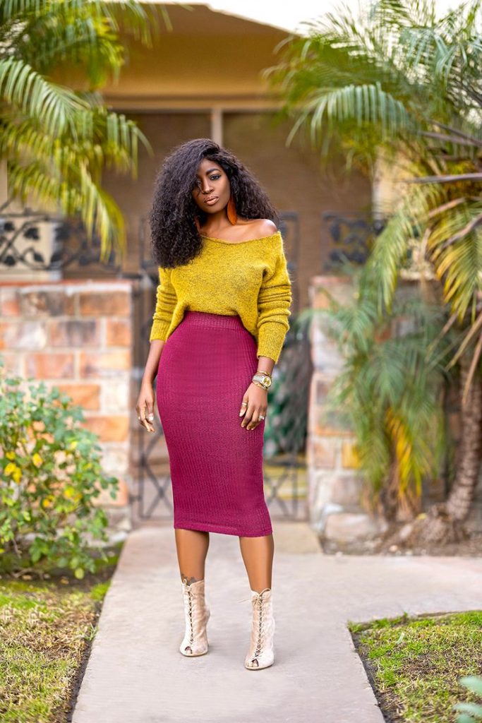 A burgundy ribbed pencil skirt is styled with a cozy mustard wool sweater, blending rich, autumnal hues for a season-ready outfit. The slouchy fit of the sweater balances the structured skirt, while nude lace-up boots elongate the silhouette.