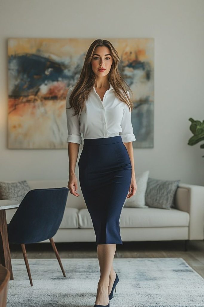 A navy blue pencil skirt paired with a white button-down is a staple for work business. This outfit is sleek and polished, ideal for important meetings or everyday office wear. The form-fitting cut accentuates curves while maintaining a refined aesthetic.