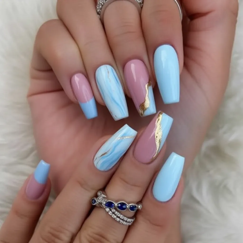 This manicure feels modern, stylish, and a little unexpected. The soft blue paired with subtle marble and gold accents creates a look that’s polished but interesting. It’s confident, clean, and very chic—perfect for welcoming spring with a fresh perspective.