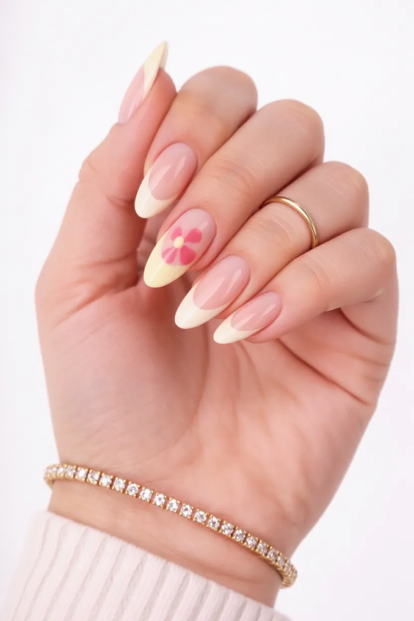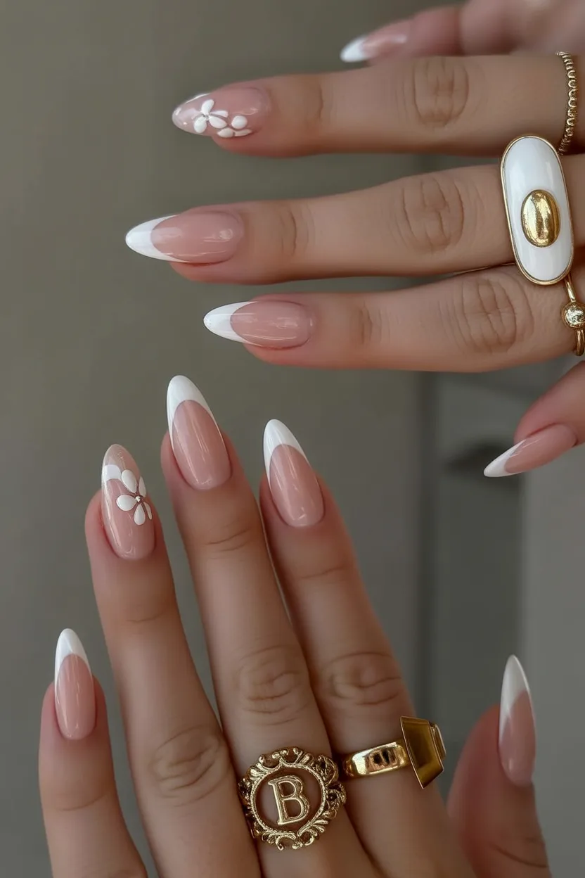 As an almond French style, it flatters longer nail beds and creates an elegant silhouette. The neutral base keeps it versatile, while the tiny floral accent adds personality without overwhelming the look. This works beautifully as acrylic almond for added strength, especially if your natural nails need support. Keep jewelry minimal and let the nails shine.