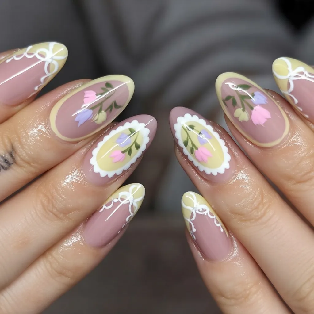 This design feels like something you’d find in a vintage vanity drawer—romantic, detailed, and full of character. The layered florals and soft outlines create a nostalgic mood that feels warm and expressive. It’s artistic without being overwhelming, and it brings a beautiful, storybook quality to spring nails.