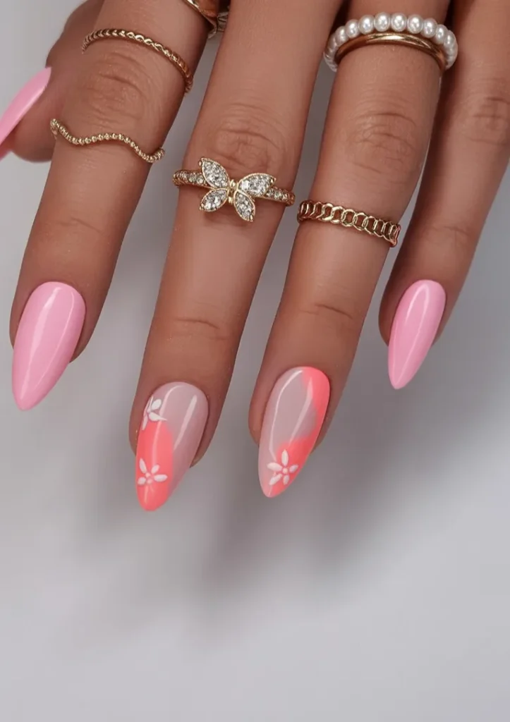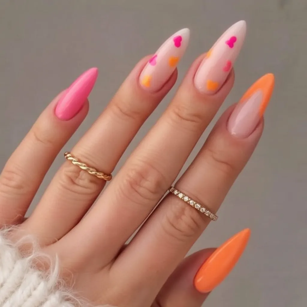 These nails feel like bottled joy. The mix of pink and orange with tiny heart details brings a playful, sunny energy that instantly lifts your mood. It’s fun, flirty, and a little bold—but still balanced by the soft almond shape that keeps everything looking intentional. This is the kind of cute manicure that makes spring feel exciting again.