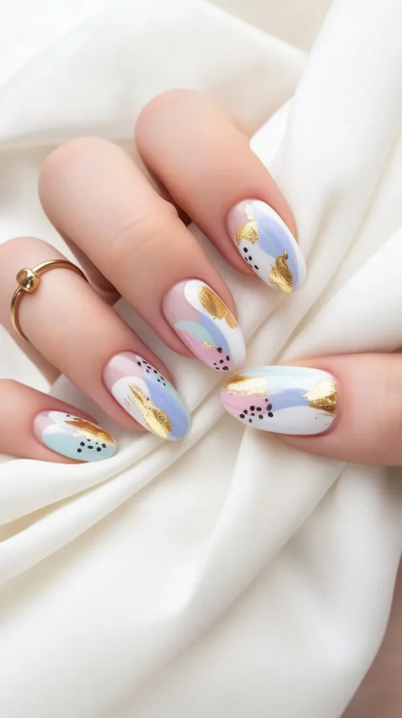 This design feels like wearable art—soft pastels drifting together with brushed gold accents that catch the light just enough to feel special. It’s elegant without being stiff and creative without being chaotic. The overall mood is calm, modern, and quietly luxurious—the kind of manicure that makes your hands feel styled even when the rest of you is dressed very simply. It fits beautifully into the world of chic spring inspo.