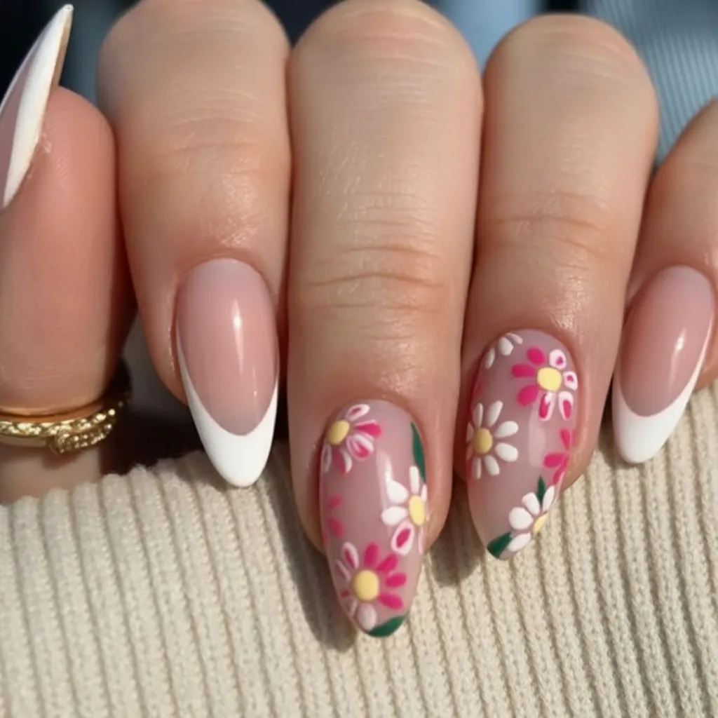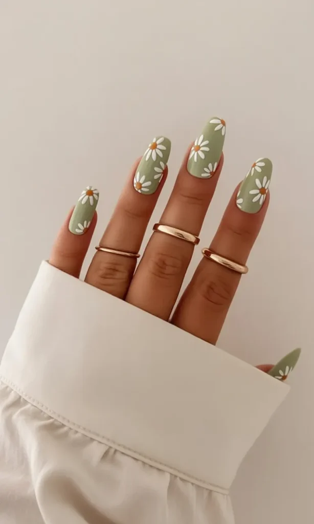 There’s a relaxed, earthy charm to this almond green manicure that feels incredibly fresh. The daisy accents add a sweet, springtime softness without overpowering the look. It’s calm, grounded, and cheerful—like a breath of fresh air after winter finally fades.