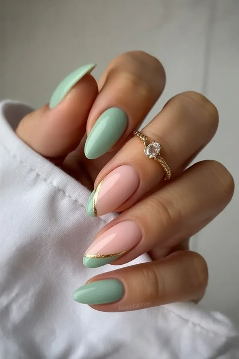 Fresh, earthy, and unexpectedly luxurious—this almond green manicure feels like spring grown up. The soft green paired with fine gold lines gives a subtle richness that feels chic and modern. It’s calming but confident, perfect for someone who loves understated elegance with a twist.