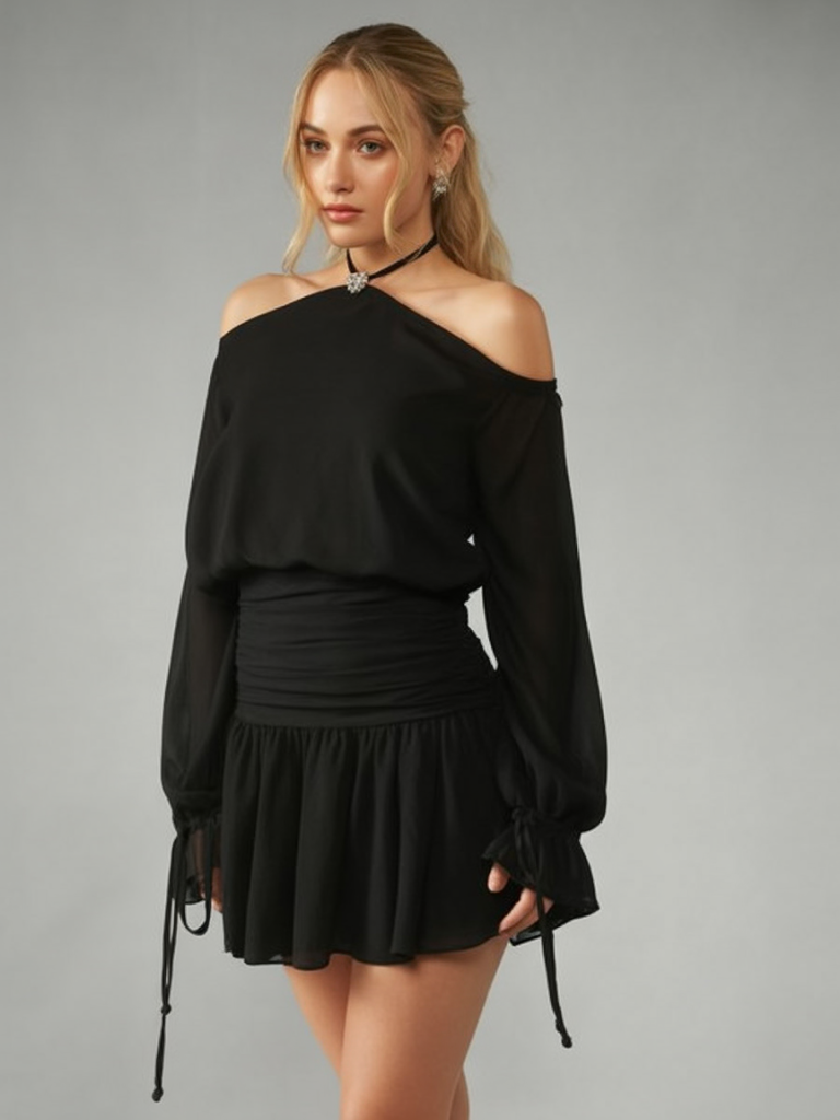 This off-shoulder The black chiffon mini dress has that quietly dramatic vibe that always feels right for a night out. The neckline frames your shoulders beautifully, while the blouson top and ruched waist create a soft, romantic shape that still shows your figure. The skirt flutters with every step, making the whole look feel light and flirty rather than overly formal. It’s the kind of cocktail dress you reach for when you want to look polished, a bit mysterious, and completely in control of your evening.