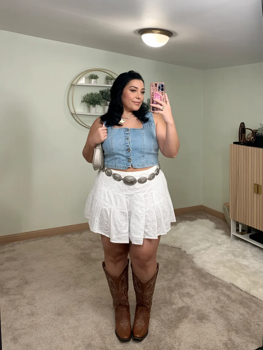 This outfit feels sharper and a little more grown-up, in the best possible way. The dark denim vest-style top creates such clean structure through the waist and torso, while the short white skirt keeps the look playful and light. It’s one of those combinations that feels polished before you even add accessories, and the Brown boots bring in that classic Western finish without overwhelming the outfit. If some concert looks feel too teen, too boho, or too chaotic, this one is the answer. It has presence, it has shape, and it gives off that confident “I know exactly what works on me” energy that so many women are craving right now.