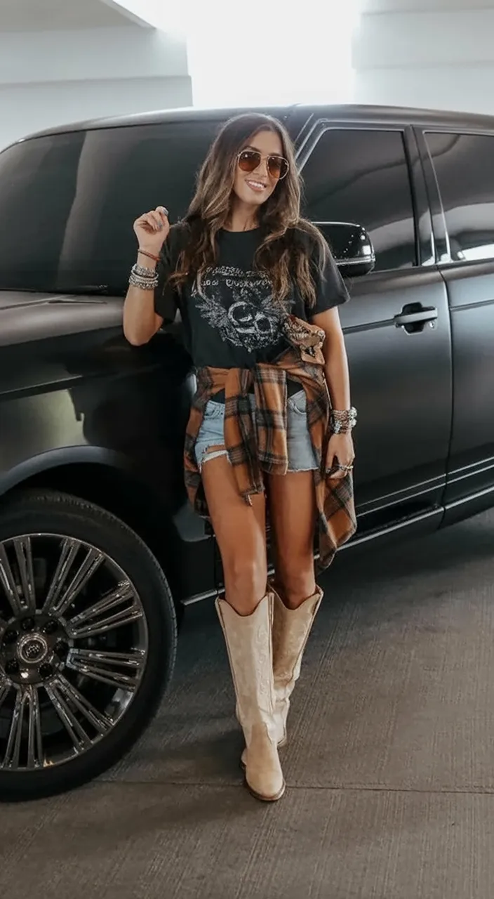 This look is pure easygoing concert energy, and that’s exactly why it works so well. A worn-in graphic tee with denim shorts already feels like a reliable favorite, but adding the plaid shirt tied at the waist and those tall neutral boots gives it that unmistakable country finish. It’s relaxed, flattering, and just rugged enough to feel authentic without trying to be too polished. There’s also something very practical-chic about it, like the outfit version of knowing exactly what kind of night you’re headed into. For women looking for casual country concert outfit 2026 ideas that still feel styled, this one is a total keeper.