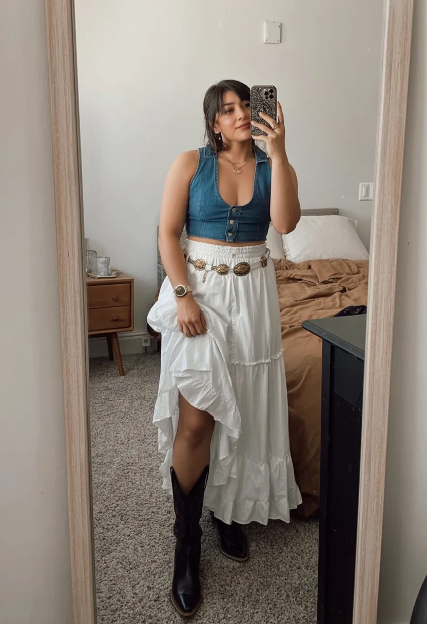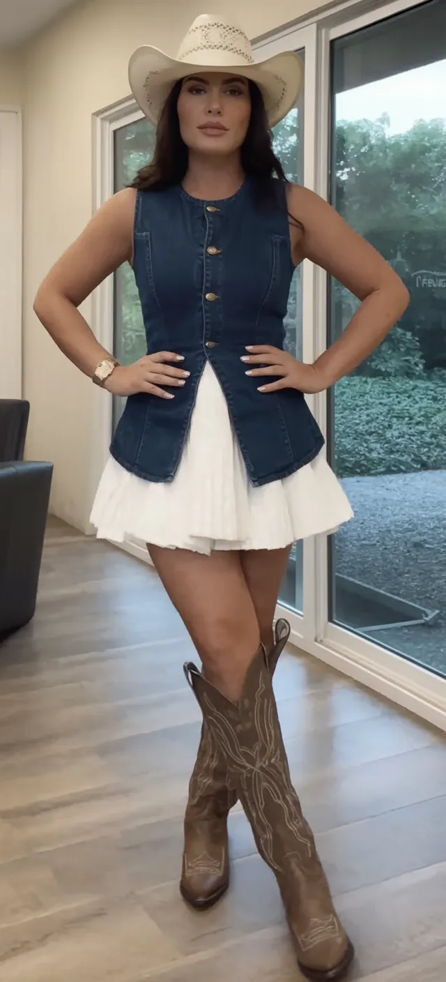 12. Denim Vest, Cream Skirt, and White Cowboy Hat