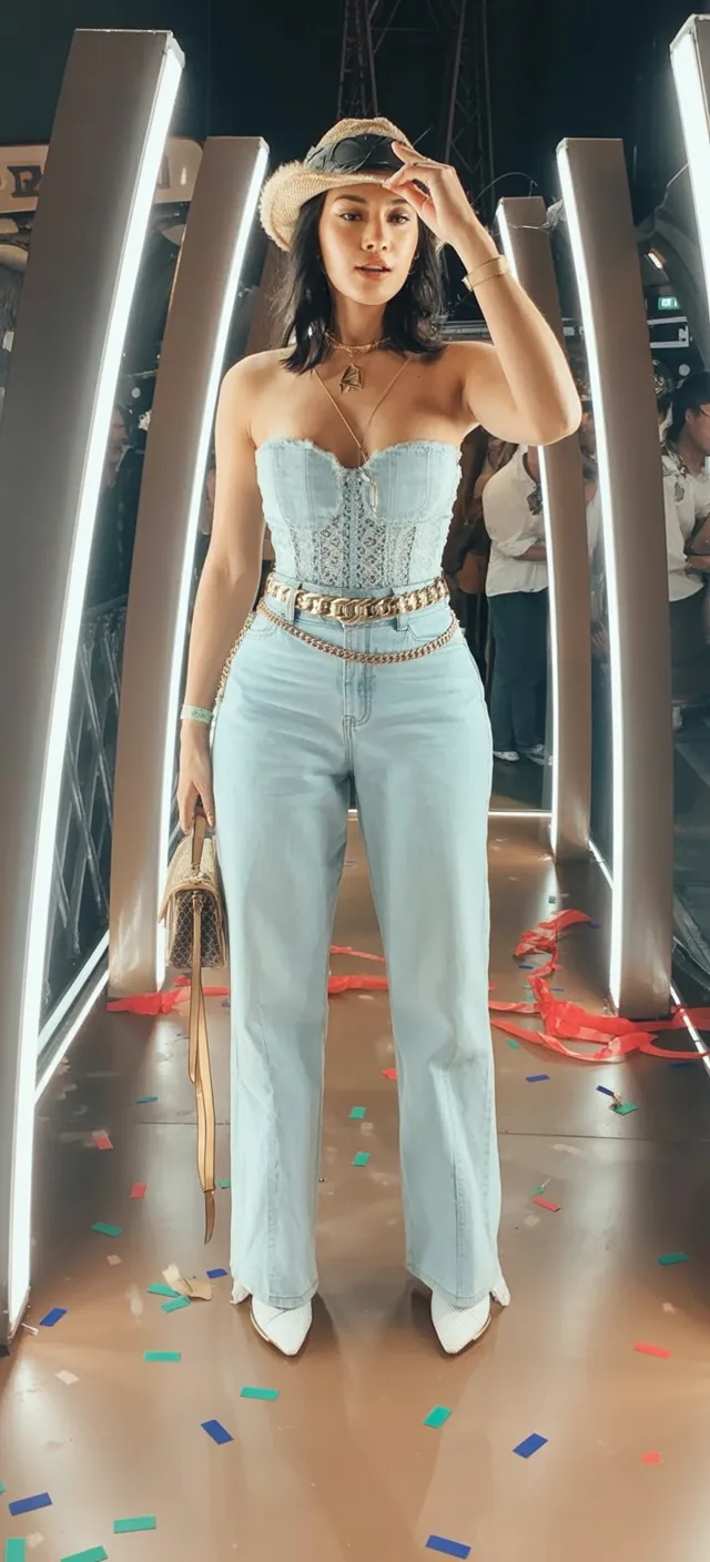 This outfit is for the woman who wants her country look to feel polished, modern, and just a little luxe. A structured denim corset-style top with matching light-wash jeans creates a clean, elongated line that instantly feels more elevated than the usual cutoff route. Then come the White boots, which brighten everything and give the whole look that sharp, fashion-girl finish. There’s a little Western, a little glam, and a little after-dark energy happening here, which makes it especially good for concerts that turn into dinner or drinks after. Out of all the jeans-based ideas, this one feels the most refined without losing any personality.