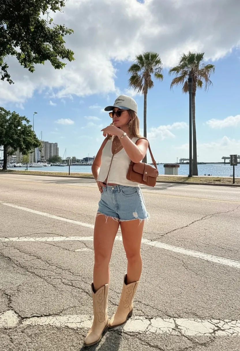 Current trends are still very much loving streamlined basics mixed with Western accessories, and this outfit fits that mood perfectly. The neutral boots make it feel a little more refined than darker pairs, and the fitted top helps balance the relaxed cut of the shorts. It’s a smart choice for women who want something breathable and flattering that can handle heat, walking, and a full day outside. Add layered necklaces, a ball cap, or sunglasses depending on your mood. For summer ideas, it really doesn’t get much easier than this.