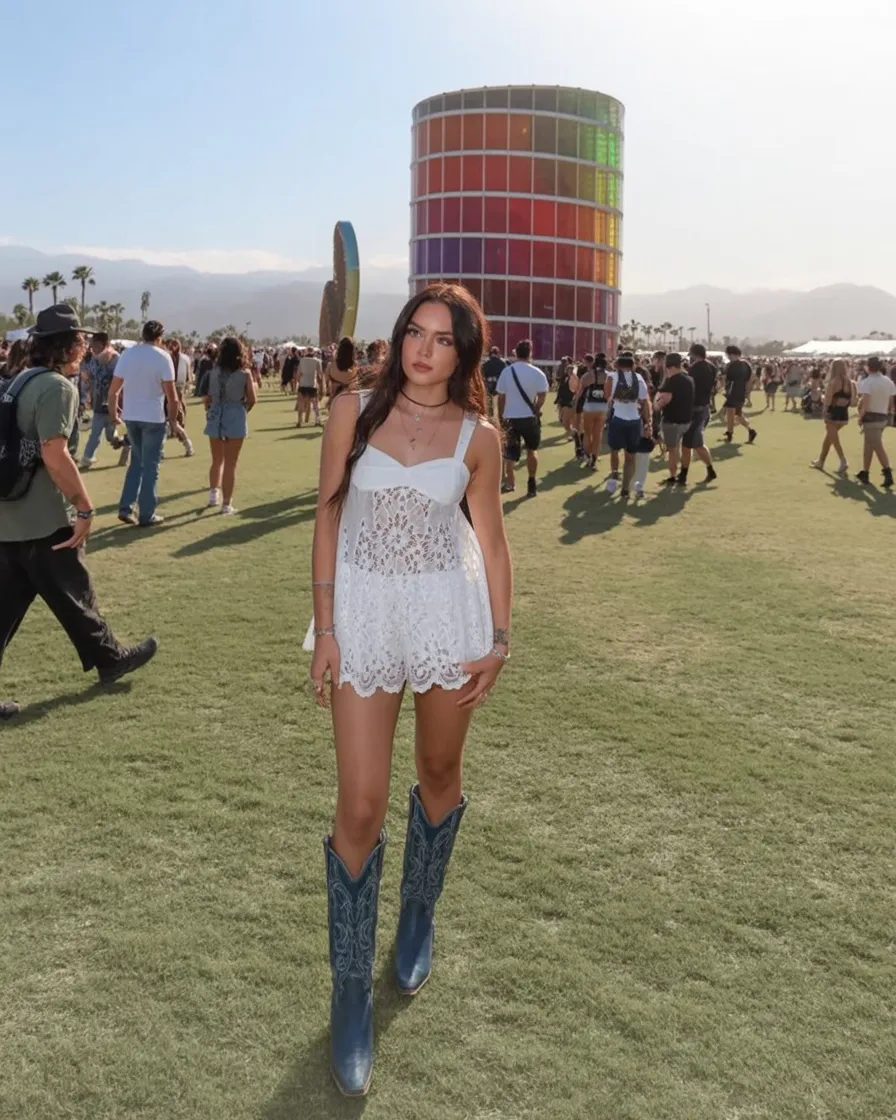 This outfit feels like sunshine, live music, and that little burst of confidence you get when you know you nailed the dress code without looking like you tried too hard. The white lace mini Dress has such a soft, feminine charm, but the blue cowboy boots keep it from drifting into overly sweet territory. That contrast is exactly what makes it memorable. It feels fresh, playful, and a little flirty in the best way, like the kind of look you wear when you want to feel pretty and bold at the same time. For country concert outfit 2026 ideas, this one hits that sweet spot between romantic and Western with a clean, standout finish.