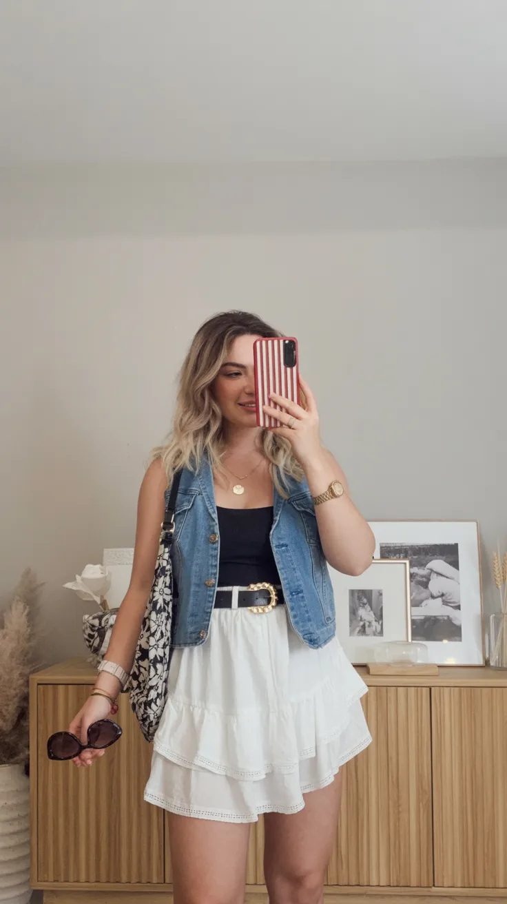 Compared with a full denim Dress or cutoffs, this pairing gives you a softer silhouette and a little more styling freedom. You can wear it with simple gold jewelry, oversized sunglasses, and either Brown boots or sandals depending on the venue. It flatters a lot of body types because the skirt skims rather than clings, and the vest adds shape through the torso. For ideas for summer or even warm spring weekends, this one is a winner because it looks thoughtful but never overdone. It’s a lovely option when you want something light, pretty, and easy to move in.