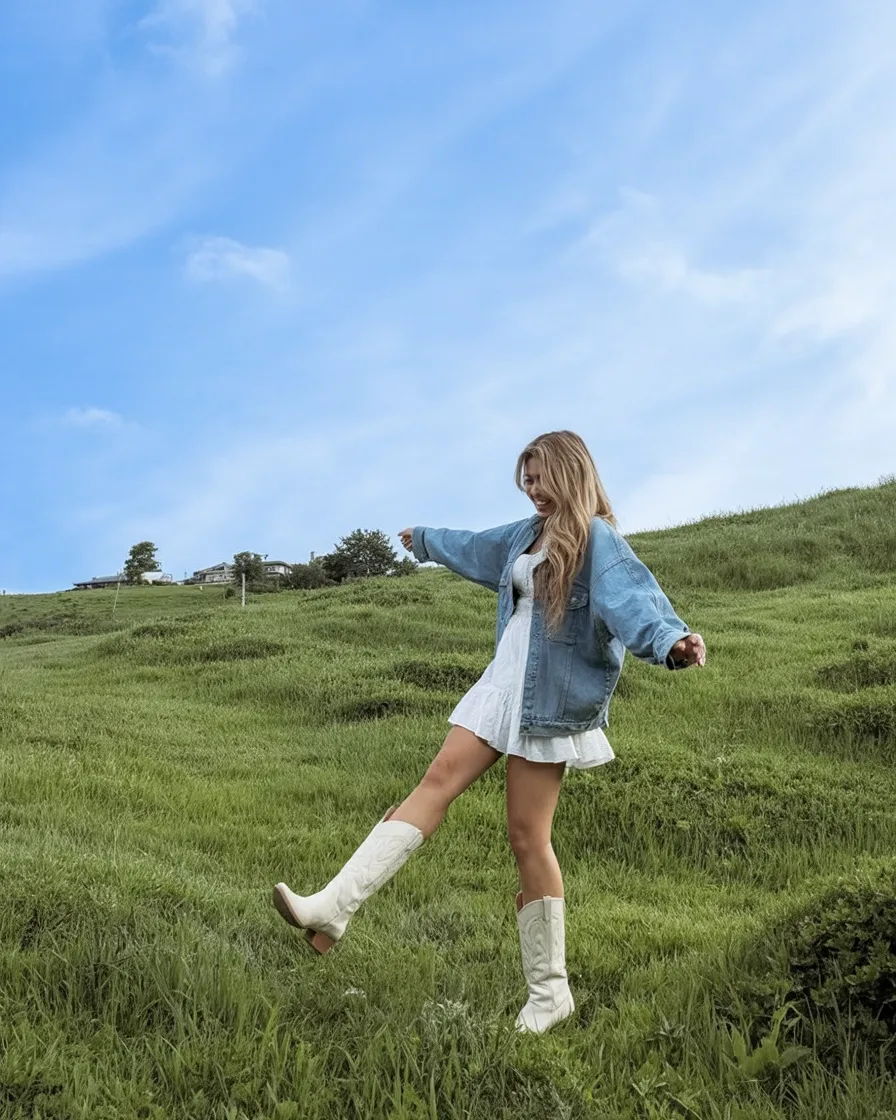 This one has that carefree, open-sky feeling that makes you want to book tickets immediately. A fluttery white mini Dress paired with an oversized denim jacket feels romantic without being precious, and the White boots give the whole thing that crisp country finish that always looks good in motion. It’s soft, youthful, and just polished enough to feel special, which is why it keeps showing up in the best country concert outfit 2026 ideas. There’s something about this mix that feels equal parts sweet and free-spirited, like you’re ready for live music, a little breeze, and one of those nights that ends up being way more fun than expected.