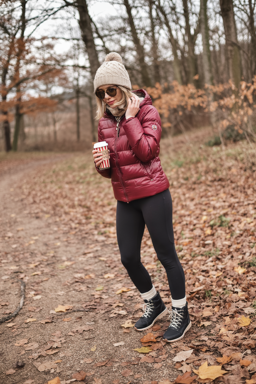 A rich berry puffer instantly brightens a grey path, and this outfit proves it. Paired with black leggings, hiking-inspired boots, and a chunky knit beanie, it feels like the perfect mix of cozy and outdoorsy. You’re ready for a weekend walk, a quick trail with the dog, or just a slow solo stroll to clear your head. The bold color keeps it from feeling too utilitarian, while the slim leggings balance the volume on top so the whole look stays flattering and not overwhelming.