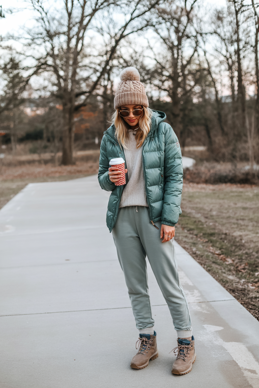 The overall vibe is easygoing and open, with just a hint of adventure. The rugged boots say you’re ready for slippery docks or snowy sidewalks, while the soft knit hat and puffer promise warmth and comfort. This is a great go-to for women who want simple ideas that still look thoughtfully styled—perfect for travel days, winter beach walks, or exploring a new part of town. Add a bold scarf or lipstick if you want to sharpen the aesthetic, or keep everything tonal for a softer, cozier feel.