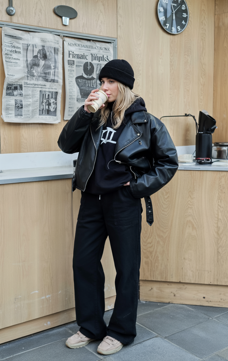 Some days, the only answer is head-to-toe black. This outfit takes that mood and gives it a relaxed, modern twist: a slightly oversized moto jacket thrown over a graphic hoodie, wide-leg pants, and laid-back sneakers. The beanie and casual coffee cup add to the off-duty vibe, while the leather brings just enough edge to feel like a little baddie without trying too hard. It’s the perfect winter formula when you want to look like you woke up this cool, especially in NYC or any busy city where black is basically a uniform.