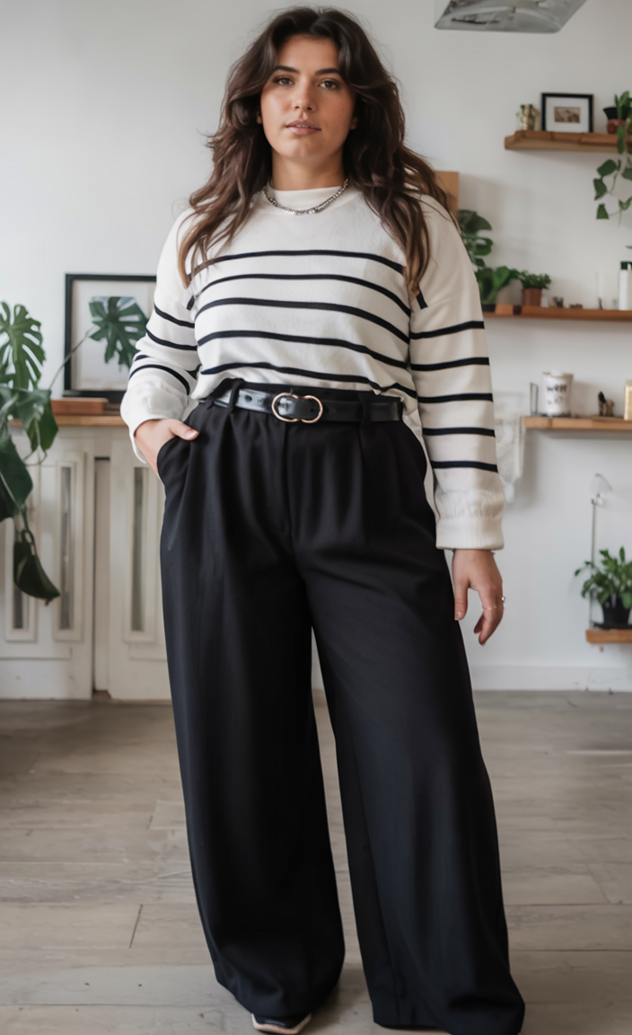 This look is proof that sometimes the simplest pieces pack the biggest punch. A Breton-style striped sweater tucked into high-waisted black trousers creates an instant hourglass effect, especially with the cinched belt defining the waist. The wide legs drape beautifully over whatever shoes you choose, and the soft knit keeps things cozy without losing its structure. It’s that perfect middle ground between casual and office-ready, ideal for women who want their winter wardrobe to move easily from work to dinner.