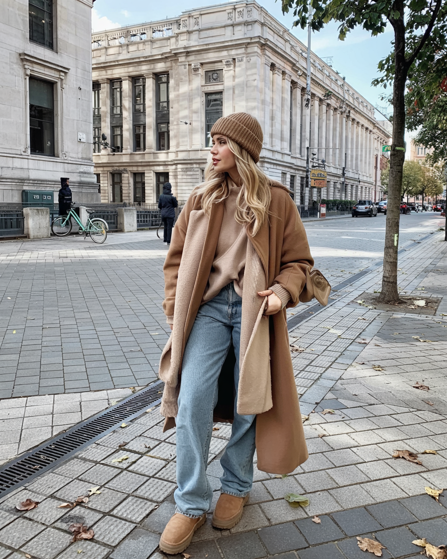 There’s something effortlessly European about this layered camel outfit, like you’re strolling through York or NYC on a crisp December afternoon. The long coat, soft sweater, and relaxed jeans create that grown-up aesthetic that still feels cute and approachable. A ribbed beanie and flat suede boots keep the mood cozy instead of formal, so you can wander the city, grab lunch with friends, or hop on the train without feeling overdressed. It’s the sort of winter look that quietly says, “Yes, I have my life together,” even if you threw it on in ten minutes.