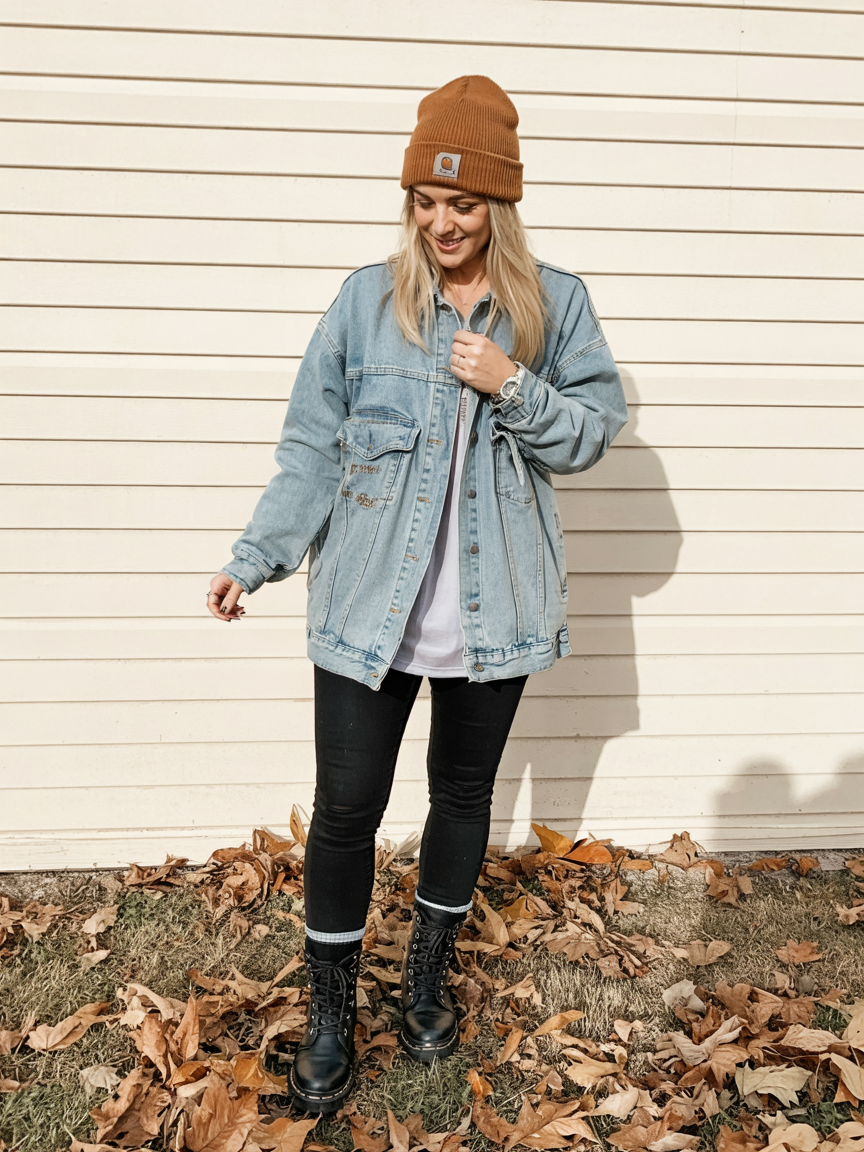 If your inner teenager still loves a little edge, this oversized denim jacket look is such a fun way to dress for winter without feeling frumpy. The slouchy jacket, simple tee, and black skinnies give off a relaxed, almost Y2k throwback vibe, while the lace-up combat boots keep it grounded and practical. A beanie tops everything off and adds that hint of trendy street style that feels right at home whether you’re in the suburbs or downtown NYC. It’s the kind of outfit that makes you walk a little faster and stand a little taller.