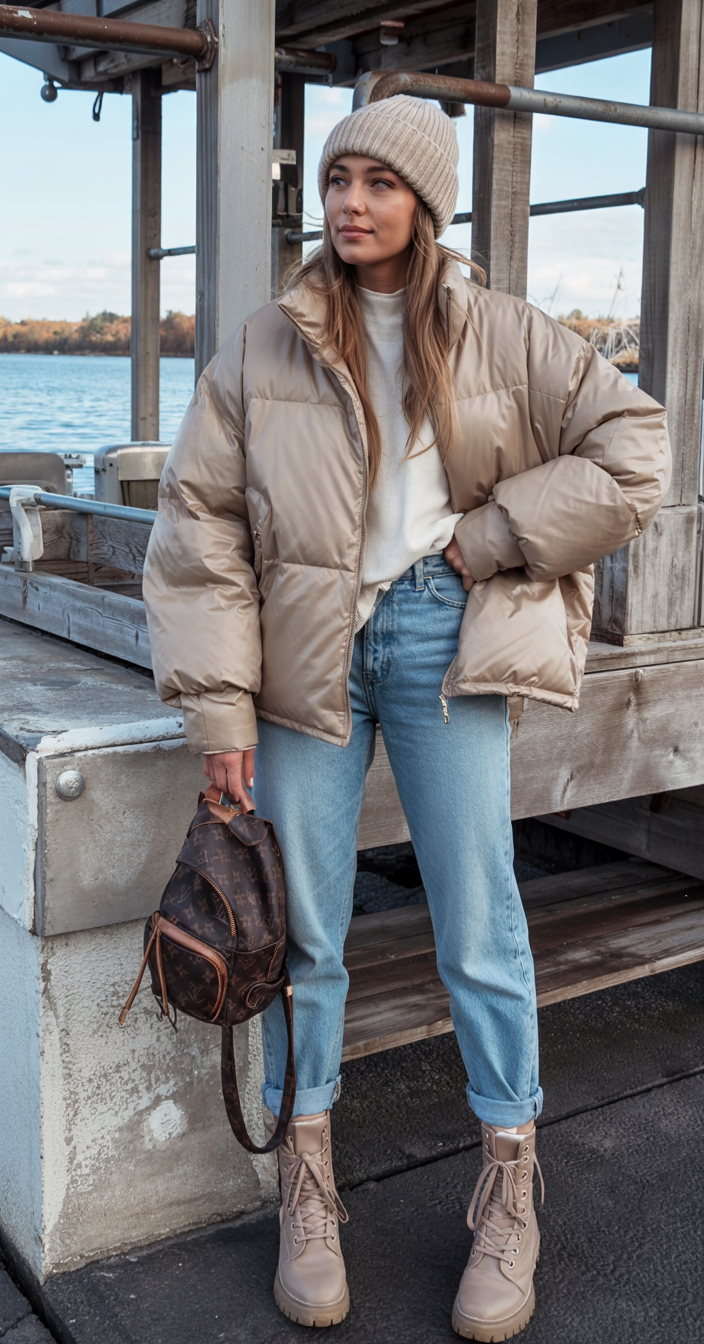 This soft neutral puffer paired with light blue jeans and sturdy lace-up boots feels like the definition of relaxed winter chic. It’s casual enough for a day by the water, but polished enough that you’d still feel comfortable grabbing dinner afterward. The beanie and compact backpack keep it practical and comfy, while the gentle color palette flatters a wide range of skin tones, from very fair to deep. It’s one of those winter outfits that quietly blends into your life and makes chilly days feel just a little more special.