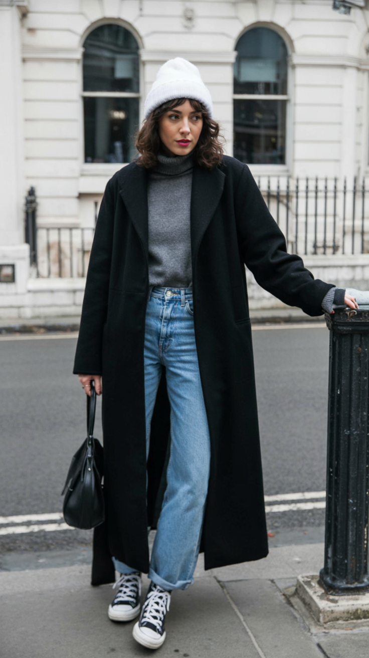 This outfit is pure city energy: a sweeping black coat, grey turtleneck, straight-leg jeans, and classic sneakers, topped with a soft white beanie. It has that minimalist winter aesthetic that looks just as at home in NYC as it does in a quiet neighborhood. The coat adds drama, while the denim and sneakers keep things grounded and easy. It’s an instant confidence boost—sharp, smart, and just a little mysterious, like you’re heading to an art show or after-work drinks, even if you’re only running errands.