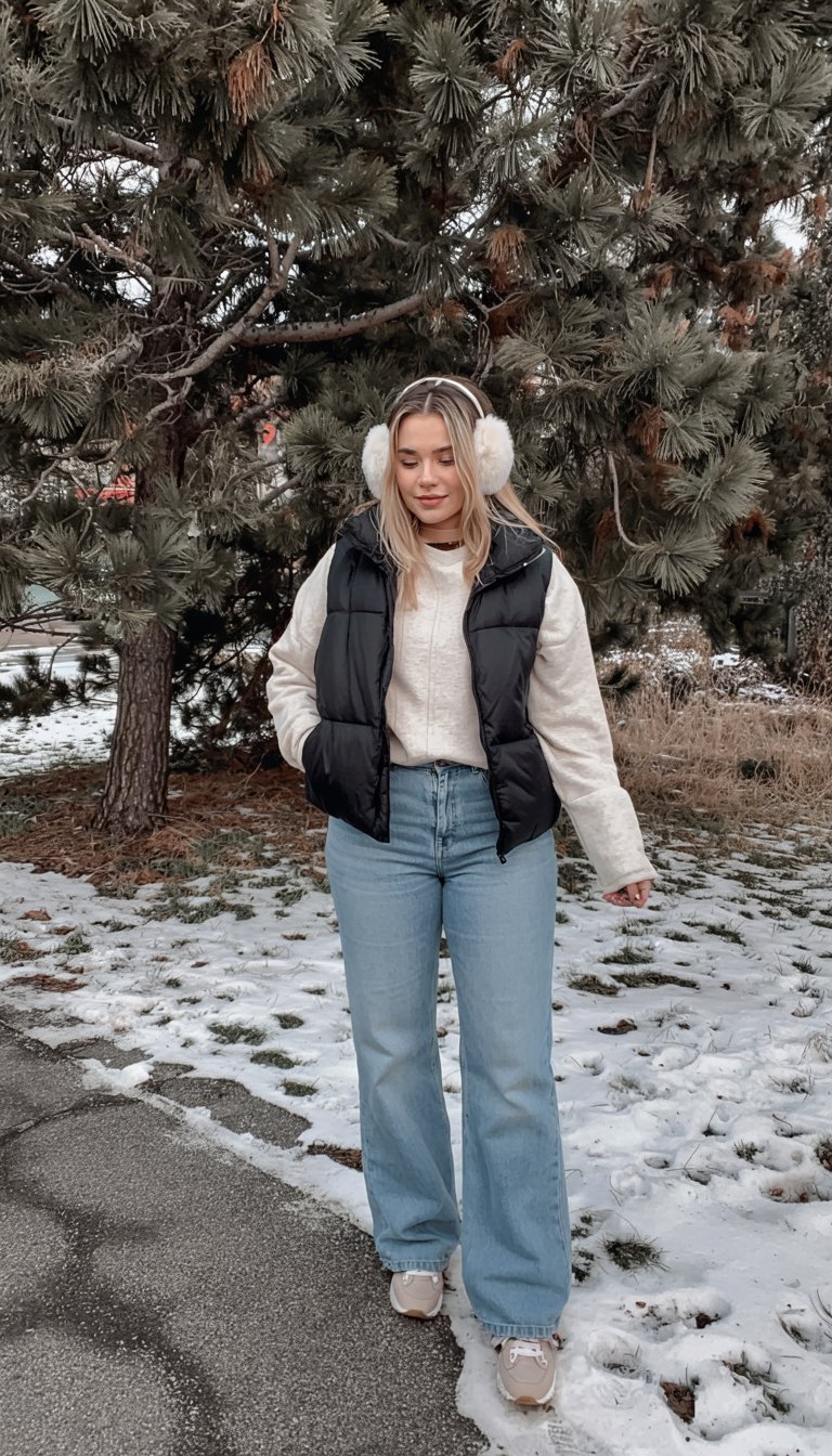 Nothing says “cute cold-weather comfort” like fluffy earmuffs and a puffer vest. Here, a black vest sits over a light sweater and wide-leg jeans, finished with neutral sneakers for an easy, laid-back feel. The earmuffs and soft hair framing the face give it a playful, youthful twist that still works beautifully for grown women. It’s exactly what you want to throw on for a winter walk, a casual date at the park, or a relaxed day wandering around town.