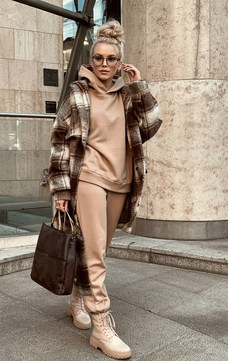 This is the kind of cozy winter outfit you put on once and then wonder how you ever lived without it. The soft camel hoodie and joggers feel like pajamas, but the brushed plaid shacket and structured tote instantly turn it into real street style. Chunky lace-up boots anchor everything and give a subtle baddie attitude, while the messy topknot and glasses keep it cute and approachable. It’s an easy, neutral aesthetic that works for coffee runs, travel days, or those long Saturdays when you’re out and about but want to feel secretly comfy.