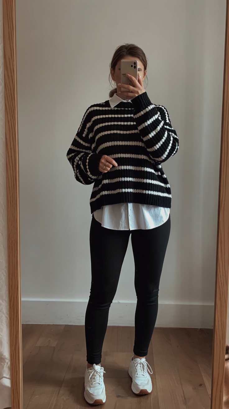 This outfit has that quietly polished vibe you get from French street style: a crisp white shirt peeking out under a black-and-cream striped sweater, paired with black leggings and clean white sneakers. The longer shirt hem and collar soften the knit and give it a little preppy twist, while the fitted leggings keep everything from feeling bulky. It’s cozy enough for working from home but pulled together enough that you won’t mind popping out for a quick meeting or school pickup.