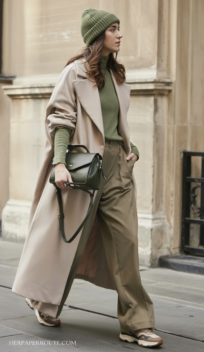 This outfit is all about mood: rich olive tones layered under a sweeping camel coat, finished with a ribbed beanie and chunky sneakers. The almost-monochrome palette feels sophisticated and a little unexpected for winter, a nice break from the usual black and grey. The long coat moves beautifully as you walk, giving you that main-character energy as you cross the street or stride into the office. It’s chic, grown-up street style with just enough sporty attitude to keep it relaxed.