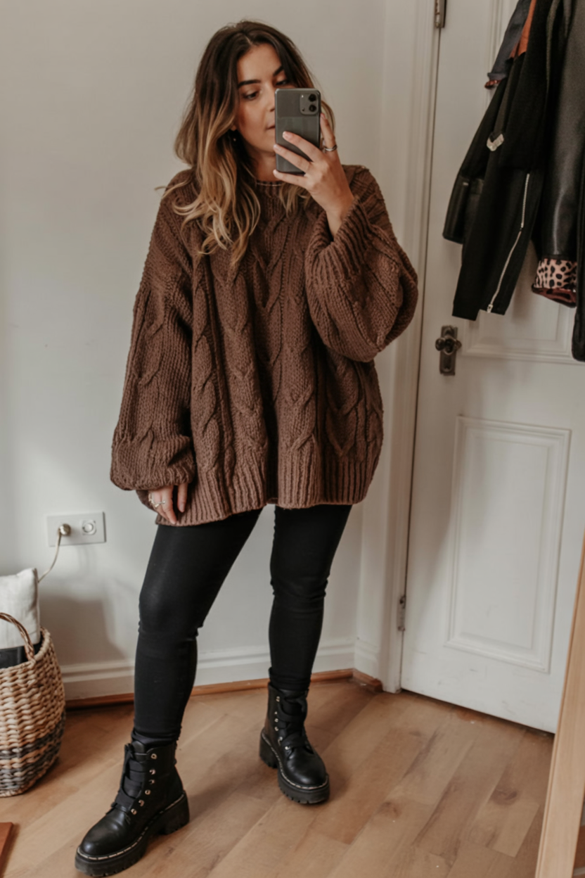 There are those days when all you want is to disappear into an oversized warm sweater and still look like you made an effort. For that, this oversized warm chocolate sweater, sleek and fitted black leggings, and winter platform boots are the perfect outfit. The warm chocolate color is cozy and flatters most women and creates a lovely contrast with the black leather. This is a perfect ‘stay at home but might go out’ look that is polished enough if a friend suggests dinner. Adding a favorite oversized ring or simple hoop will make one look ‘cute and camera-ready’ to go out for dinner.