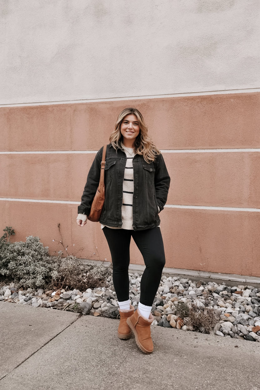 This outfit feels like weekend brunch with people who make you laugh until your mascara runs. The striped knit, slightly oversized utility jacket, and black leggings are casual enough for a coffee date yet pulled together enough for a quick stop at school events or errands around town. Tan mini boots and a leather crossbody bag warm up the palette and make everything look intentional. It’s cozy, comfy, and practical, but there’s still a little baddie confidence in the way the jacket hangs and the leggings streamline the legs.