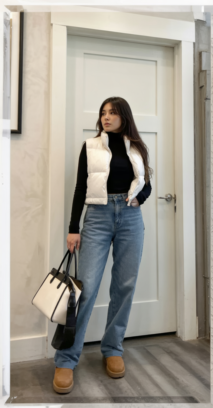 This combination is extremely modern and clean: straight-leg jeans, a sleek black turtleneck, and a white puffer vest with sand-colored boots. The classy and minimal feel of this outfit comes from the contrast of the colors and the simplicity of the pieces, resembling a winter capsule wardrobe. The structured handbag gives the outfit polish, making it feel perfect for running errands or when one is more pulled together. It is simple, chic, and perfect for those wanting a streamlined aesthetic without a lot of fuss.