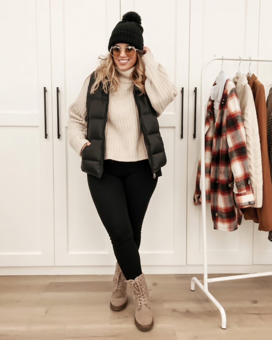 This outfit is the most relaxed wintery look I can think of. I really like the chunky knit turtleneck paired with black skinnies and a black puffer vest. The tan lace-up boots and pom-pom beanie are cute, too! It’s comfy, and the round sunglasses and smile are charming, like you’re bringing your own sunshine even on dull days. The overall look is really versatile, and it’s great for the house if you want to feel a little dressed up or for running errands that are quick, when you really just want to snuggle on the couch.