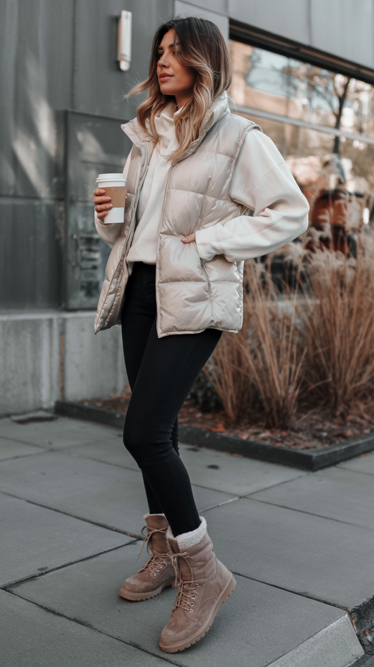 This is the kind of winter outfit you pull on for a quick latte run and end up wearing all day because it just feels right. The glossy puffer vest, soft sweatshirt, and slim black leggings make a simple little uniform that still looks chic and put-together. Neutral tones keep everything calm and classy, while the lace-up boots give it that slightly rugged street-style edge. With one hand in your pocket and the other wrapped around a coffee cup, you look cozy, confident, and ready to take on a busy day without overthinking what to wear.