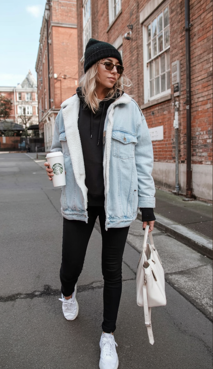 This look nails that relaxed winter city mood: a cozy sherpa-lined denim jacket, a dark hoodie, slim black jeans, and clean white sneakers. It has the energy of quick errands that somehow turn into a long walk, hot chocolate in hand. The beanie and sunglasses add a hint of mystery and a touch of baddie confidence, while the roomy tote makes it practical for work, school meetings, or a spontaneous coffee date. It’s casual, chic, and just a little sporty all at once—perfect for those in-between days when you’re not sure where the day will take you.