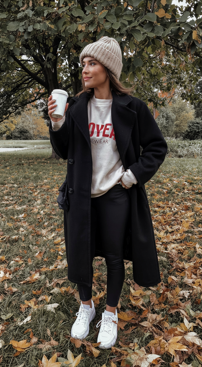 This outfit feels like Sunday in the park, crunching through leaves with a coffee in one hand and your phone in the other. A long black coat drapes over a cream sweatshirt with a bold red print, slim black leggings, and bright white sneakers. The ribbed beanie adds texture and keeps everything cozy, while the mix of sporty and tailored pieces gives off that effortless winter street style aesthetic. It’s casual enough for school sports sidelines, yet polished enough to swing by brunch afterward.