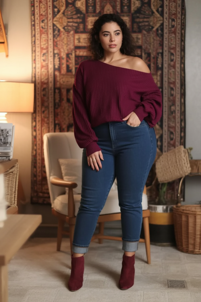 This sweater in a deep wine color is just that little bit sexy yet not trying hard by falling off the shoulder–it has a seductive fall zing. It comes with a matching pair of fitted cuffed jeans and matching boots so it is a date appropriate outfit yet with that sort of comfortable, homey feel.