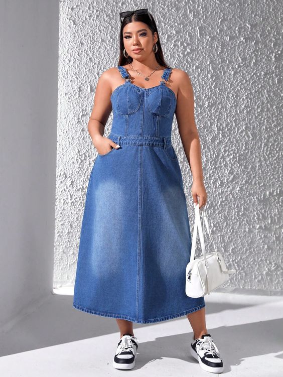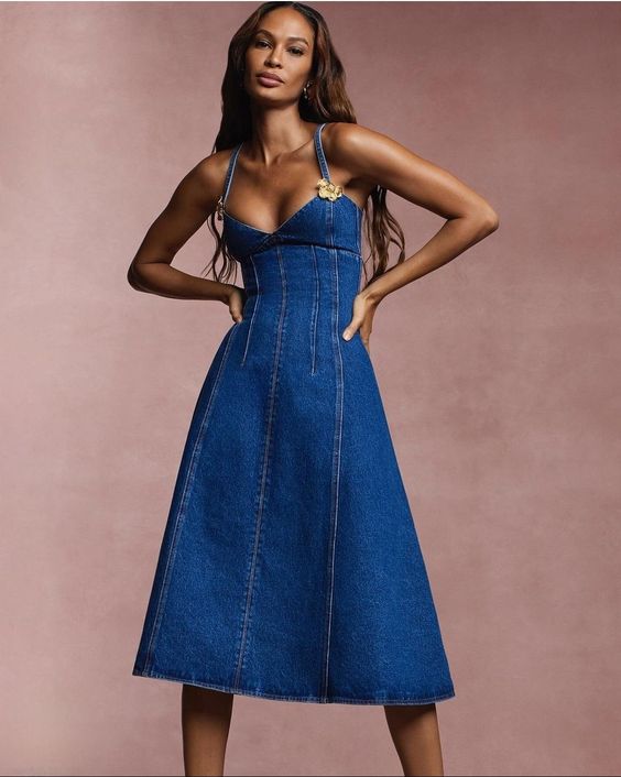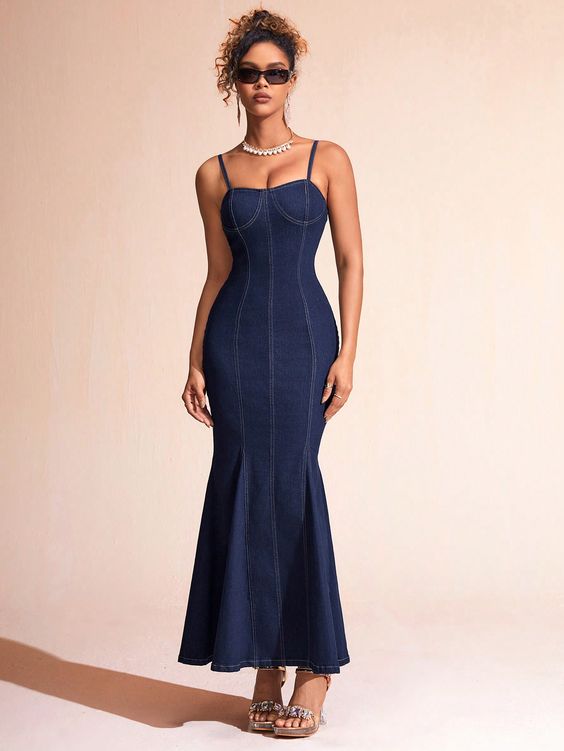 A mermaid cut denim dress with delicate straps is a blend of classic charm and modern flair. It’s perfect for a summer evening dinner or a Christmas gathering when styled with elegant accessories.