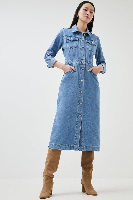 Short and sweet, the skater dress is a nod to youthful exuberance. It’s a denim dress outfit aesthetic that’s playful and pairs well with both ballet flats for a day in the park or ankle boots for a night out with friends. Add a textured scarf for a pop of color on a breezy day.