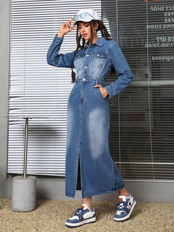 This look is for those who love to make a statement with their footwear. The full-length denim dress paired with bold sneakers is a perfect marriage of style and comfort, suitable for any casual occasion.