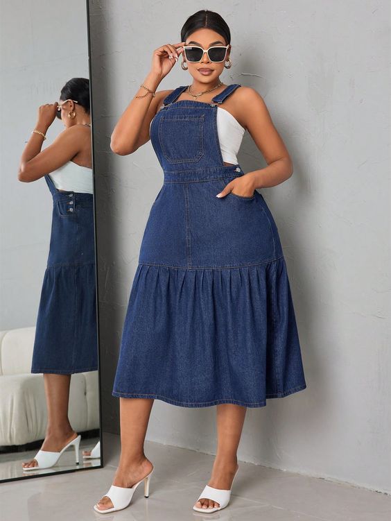 Layering a ruffled midi denim dress over a t-shirt is a chic take on the denim dress outfit ideas 2024. It’s an effortless yet stylish look that works for a spring day out or a summer picnic. Pair with white mules for a fresh and clean aesthetic.