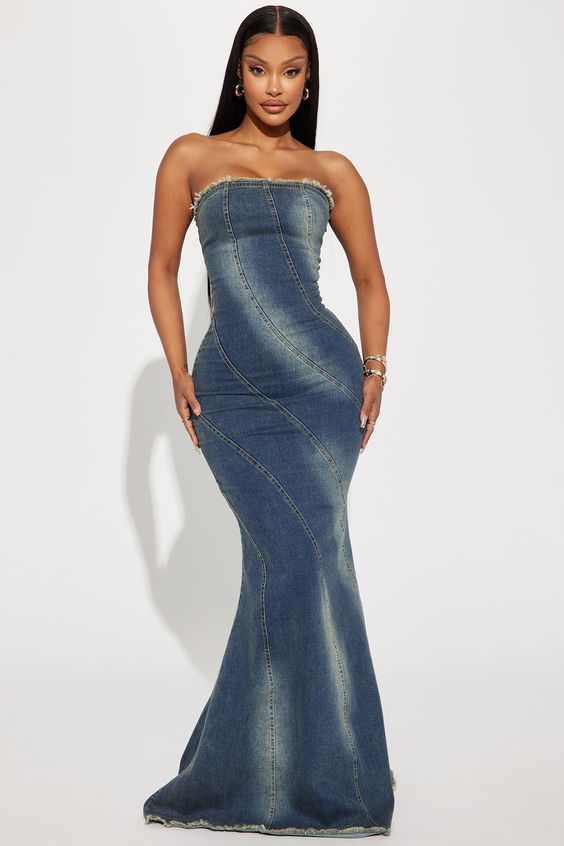 A strapless mermaid denim dress is a true showstopper, fusing classic denim with an undeniably feminine form. It’s the perfect denim dress outfit for a party or an elegant evening event. This dress sculpts and flows, creating a silhouette that is both contemporary and timeless. The frayed detailing at the bust adds a touch of edginess, balancing the overall sophistication of the gown. Accessorize with minimalist jewelry to let the dress take center stage.