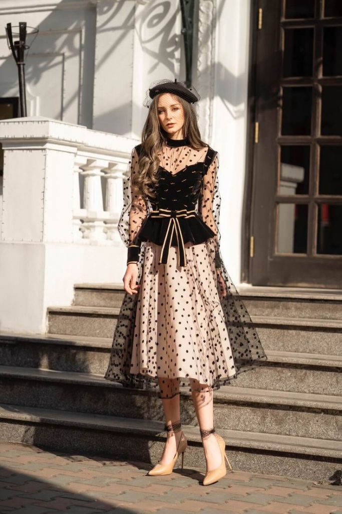 A glamorous black dress with sheer polka dot details and a layered skirt. This outfit combines playful patterns with a refined silhouette, making it a standout choice for night outings or upscale events.