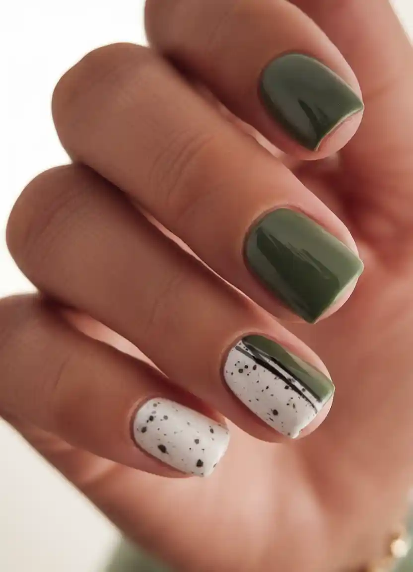 The early fall nail art is like walking in the forest in the morning with the ground, slightly melancholic and completely stylish. The deep green adds that earth feeling to it and then the speckled white also brings out that colour artistic feeling almost getting a feeling of cool breeze on your fingertips.