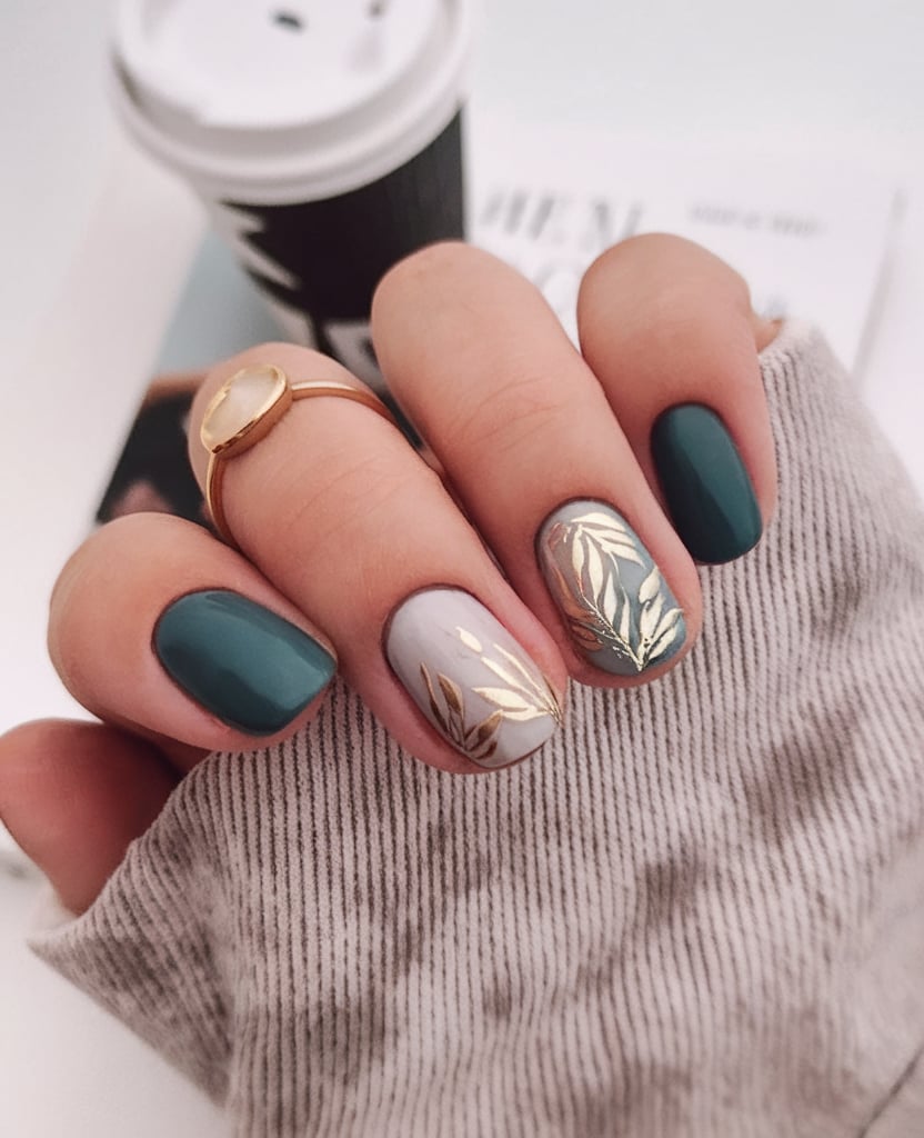 Picture yourself drinking a latte still in your blanket scarf with your nails glistening just a bit to catch the sunrays, that is what this is. The strong teal combined with light gray and gold foil leaf is an opulently natural sense of elegance that shouts early fall.