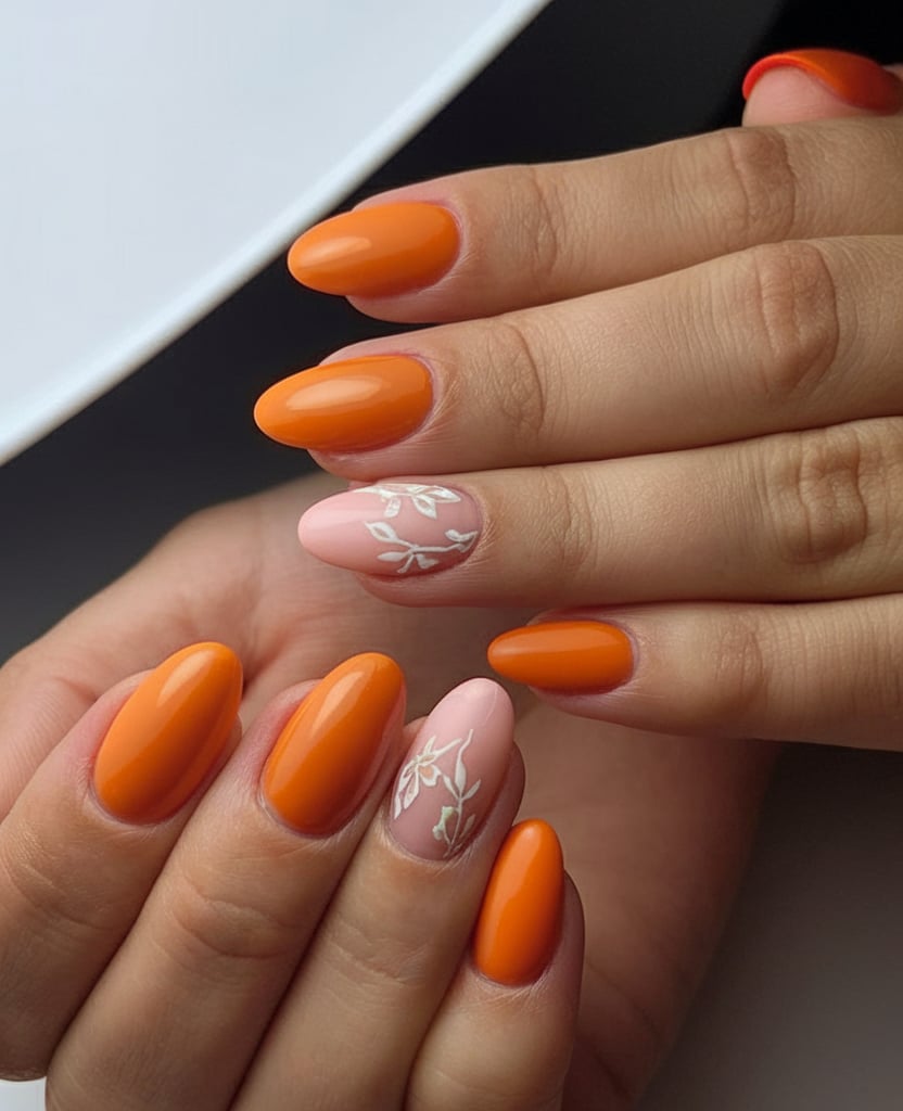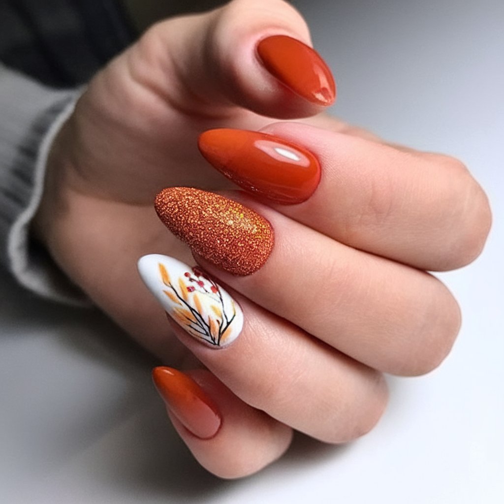 Speak of fall fantasy, this washed orange, metallic, and hand-drawn floral fall fantasia makes it feel like you are wearing a fall bouquet on your fingertips. It is energetic, full, and not too much entertaining.
